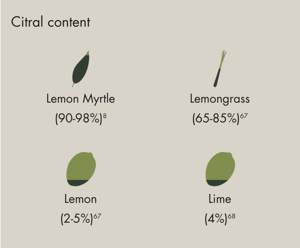 When it comes to citral content, Lemon Myrtle reigns supreme— outperforming lemons, limes, and even lemongrass. With the highest citral content of any essential oil (up to 98%), it offers an intoxicating aroma and a distinct, rich flavor that sets it apart. What’s more, a little goes a long way, making Lemon Myrtle incredibly cost effective.